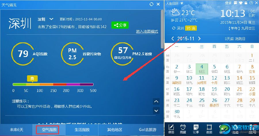 人生日历的天气预报有空气指数功能。打开电脑版人生日历,可以看到当天的综合空气指数,如深圳11月4日的空气综合指数是79,为良。虽然空气指数为良,但对于空气一向为佳的深圳来说,这已经算雾霾了,因此人生日历温馨提示“虽然可以正常在户外活动,但易敏感人群应减少外出”。
