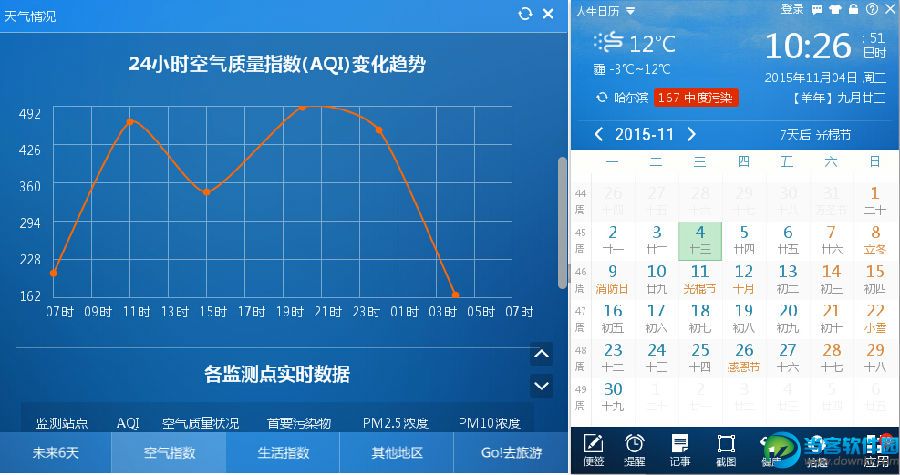 人生日历还可以监测24小时空气质量指数变化趋势。如雾霾非常严重的哈尔滨,在早上11点和晚上19点、21点等,AQI非常高,这几个时间段最好待在室内。