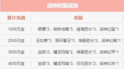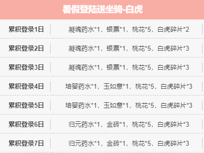 【更新信息】 》》更新维护时间:7月15日1点--3点(停服维护) 》》更新范围:珞珈山 方寸山 火焰山 紫竹林鹰愁涧 》》更新奖励:5w金币、5w灵魂、50元宝(奖励将通过邮件的形式发放) 请大家注意调整游戏时间,并相互转告,具体开服时间会根据实际情况延后或提前,敬请见谅! 一、新增内容 1、暑期战神时装返场活动 活动时间:7月19日至7月20日 活动内容:活动期间累积充值达到指定金额即可领取对应档位奖励 2、新增暑假登陆送坐骑-白虎活动 活动时间:7月16日至7月22日 活动内容:活动期间每天登陆即可领取签到奖励 3、新增暑假蟠桃树种植活动 活动时间:7月15日至7月28日 活动内容:瑶池中蟠桃园的蟠桃树日益增多,王母将多余的蟠桃树撒向西游大地等待有缘人。40级玩家可以参与活动。活动期间玩家通过浇水施肥除虫培养蟠桃树,蟠桃成熟后可获得丰富奖励,玩家还可以将成熟的蟠桃树分享给好友!除虫副本,蟠桃宝箱,关卡等都有掉落桃花,蟠桃活动商店中可以使用桃花兑换材料,更有稀有红色坐骑等特殊道具! 4、新增暑假桃花兑换活动 活动时间:7月15日至7月28日 三、其他活动 1、宝莲灯 活动时间:7月15日01:00至7月16日 活动内容:活动期间累积充值达到指定金额即可领取对应档位奖励 【累计充值500元宝】岩铁地魄*3,银票*2,凝魂药水*2,宝莲灯碎片*5 【累计充值1000元宝】岩铁地魄*4,银票*3,凝魂药水*4,宝莲灯碎片*5 【累计充值1500元宝】琅环碧玉*3,玉如意*2,培婴药水*2,宝莲灯碎片*5 【累计充值2000元宝】琅环碧玉*4,玉如意*3,培婴药水*3,宝莲灯碎片*5 【累计充值3000元宝】蟠龙玛瑙*3,金砖*2,归元药水*2,宝莲灯碎片*10 【累计充值5000元宝】蟠龙玛瑙*4,金砖*3,归元药水*3,宝莲灯碎片*10 2、7日充值 活动时间:7月15日至7月21日 活动内容:活动期间连续每天充值300元宝即可领取对应档位奖励,持续七天还可额外领取一份超值大礼包 【连续第1天】神玉*3,魔石*3,乌金*3,经文礼包*1 【连续第2天】神玉*3,魔石*3,乌金*3,经文礼包*1 【连续第3天】神玉*3,魔石*3,乌金*3,经文礼包*1 【连续第4天】神玉*3,魔石*3,乌金*3,经文礼包*1 【连续第5天】神玉*3,魔石*3,乌金*3,经文礼包*1 【连续第6天】神玉*3,魔石*3,乌金*3,经文礼包*1 【连续第7天】神玉*3,魔石*3,乌金*3,经文礼包*1 【超值礼包奖励】神玉*10,魔石*10,乌金*10,神铸选择礼包*2 3、暑期消费返利 活动时间:7月16日至7月19日 活动内容:活动期间累积消费元宝达到指定数额即可领取对应档位奖励 【累计消费100元宝】凝魂药水*2,银票*2,桃花*1,绿幽灵石*1 【累计消费500元宝】凝魂药水*4,银票*4,桃花*2,绿幽灵石*2 【累计消费1000元宝】凝魂药水*6,银票*6,桃花*3,绿幽灵石*3 【累计消费2000元宝】培婴药水*4,玉如意*4,桃花*5,绿幽灵石*5 【累计消费5000元宝】培婴药水*5,玉如意*5,桃花*10,绿幽灵石*10 【累计消费8000元宝】培婴药水*6,玉如意*6,桃花*20,绿幽灵石*15 【累计消费12000元宝】归元药水*4,金砖*4,桃花*30,绿幽灵石*20 【累计消费15000元宝】归元药水*6,金砖*6,桃花*50,绿幽灵石*25 【累计消费20000元宝】归元药水*8,金砖*8,桃花*80,绿幽灵石*30 【累计消费30000元宝】归元药水*10,金砖*10,桃花*100,绿幽灵石*40 【累计消费50000元宝】归元药水*15,金砖*15,桃花*150,绿幽灵石*50 4、狂蹄战象 活动时间:7月17日至7月18日 活动内容:活动期间累积充值达到指定金额即可领取对应档位奖励 【累计充值500元宝】低级坐骑丹*10,银票*1,凝魂药水*2,狂蹄战象碎片*5 【累计充值1000元宝】中级坐骑丹*10,银票*2,凝魂药水*3,狂蹄战象碎片*5 【累计充值1500元宝】高级坐骑丹*10,玉如意*1,培婴药水*2,狂蹄战象碎片*5 【累计充值2000元宝】宝兽内丹*2,玉如意*2,培婴药水*3,狂蹄战象碎片*5 【累计充值3000元宝】灵兽内丹*1,金砖*1,归元药水*2,狂蹄战象碎片*10 【累计充值5000元宝】灵兽内丹*2,金砖*2,归元药水*3,狂蹄战象碎片*10 5、团团 活动时间:7月21日至7月22日 活动内容:活动期间累积充值达到指定金额即可领取对应档位奖励 【累计充值500元宝】中级兽灵石*2,蜜汁鸡腿*2,金砖*1,团团碎片*20 【累计充值1000元宝】中级兽灵石*3,蜜汁鸡腿*3,金砖*2,团团碎片*20 6、限时老君祈福 活动时间:7月21日至7月25日 活动内容:活动期间累积老君祈福达到指定次数即可领取对应档位奖励 【累计老君祈福1次】银票*1,凝魂药水*1,祈运符纸*1,祈福拂尘*1 【累计老君祈福5次】银票*2,凝魂药水*1,祈运符纸*1,祈福拂尘*1 【累计老君祈福10次】银票*2,凝魂药水*2,祈运符纸*2,祈福拂尘*1 【累计老君祈福30次】玉如意*1,培婴药水*1,祈运符纸*2,祈福拂尘*2 【累计老君祈福50次】玉如意*2,培婴药水*1,祈运符纸*3,祈福拂尘*2 【累计老君祈福80次】玉如意*2,培婴药水*2,祈运符纸*3,祈福拂尘*3 【累计老君祈福100次】玉如意*3,培婴药水*2,祈运符纸*4,祈福拂尘*3 【累计老君祈福150次】金砖*1,归元药水*1,祈运符纸*4,祈福拂尘*4 【累计老君祈福200次】金砖*2,归元药水*1,祈运符纸*5,祈福拂尘*4 【累计老君祈福300次】金砖*2,归元药水*2,祈运符纸*5,祈福拂尘*5 温馨提示: 1、请玩家珍惜账号,切勿使用第三方软件修改游戏,共同营造公平的游戏环境! 2、请玩家妥善保管好自己的账号,因账号共享造成的损失,官方不予处理! 3、请勿轻信游戏内任何交易广告,防止钱财受骗! 4、请各位上仙自觉维护健康和谐的游戏环境,不要在游戏内的聊天频道中发布不