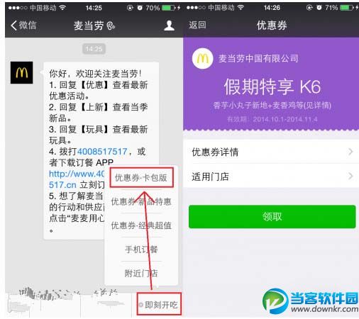 卡券功能,是公众平台向有投放卡券需求的公众号提供的推广、经营分析的整套解决方案,是连接商户与消费者的新渠道。那么,微信卡券怎么用呢?下面,小编就为大家分享一下微信卡券使用教程。 1、你需要关注一个微信公众号(小编这里以麦当劳为例),在主页面点击“即刻开吃”,选择“优惠券·卡包版”,然后选择你想要的优惠劵进行领取。 2、回到微信的页面的“我”,就可以看到在钱包功能下面多了“卡包”,点击进入,就可以看到刚才领取的优惠劵了。使用时只需要向商家出示该优惠劵即可。 3、卡券除了自用外,还能赠送给微信好友。在微信卡包中选择要赠送的卡券点击右上角“...”选项,选择“赠送给朋友”,然后在弹出的好友清单中选择好友或者微信群,便可以将卡券转赠。 4、卡券赠送之后,这张卡券就不会在你的卡包里出现了。 微信官方版本下载https://www.downkr.com/soft/20904.html 以上就是微信卡券怎么使用 微信卡券如何使用的介绍,想要了解更多更全面的资讯,请关注当客下载站。 |