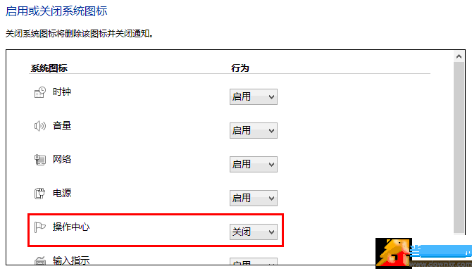 第二步:在弹出的启动或关闭系统图标中,将操作中心选择关闭,点击确定即可。再看一下是不是那个操作中心旗子图标不见了。