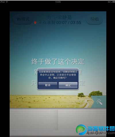 第四步:开始演唱,在右上角有一个mv模式的按钮,点击系统会提示是否继续,点击确定继续。