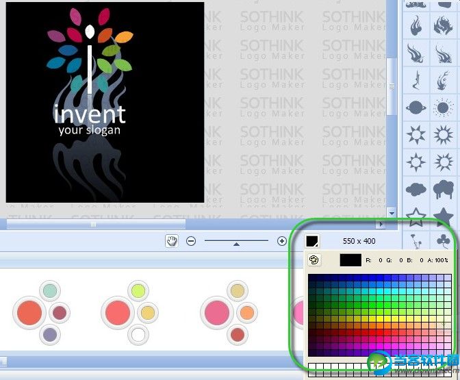 贴心小提醒:如果想对logo面板上底色进行修改,步骤也很简单。点击logo设计师界面调节栏内的“颜色”按钮,就可以看到颜色选择面板(如下图),点击所需要的颜色,logo背景色就会随之改变。