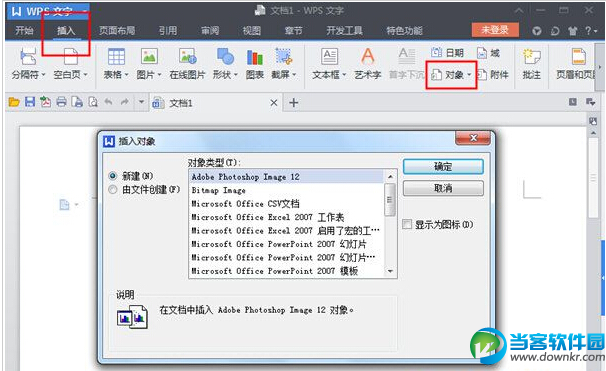 1、首先插入一张对象表格,点击上方插入,在选项栏里找到对象。