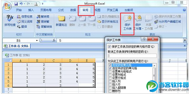 4、点击上方【审阅】,点击里面的【保护工作表】。