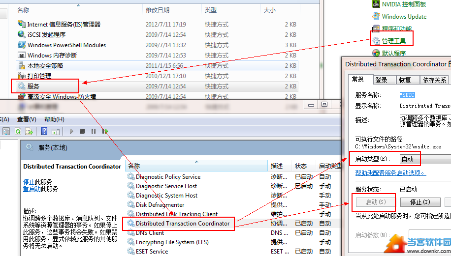 进入“控制面板---管理工具---服务---DistributedTransaction Coordinator”。把这个服务设置成自动,并且启动它。