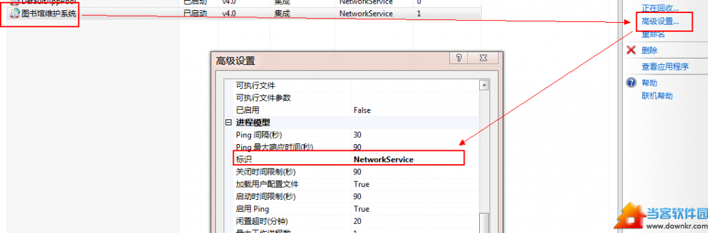 第一步,修改网站应用池进程标识为:NetWorkService。具体如图。