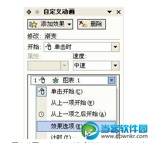 单击“确定”后,再单击“自定义动画”列表中的“渐变 图表1”的下拉箭头,在下拉菜单中选择“效果选项”命令。