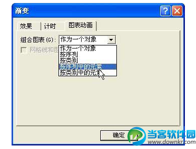 在弹出的“渐变”对话框中选择“图表动画”选项卡,然后单击“组合列表”框右侧的下拉按钮,在弹出的下拉列表中选择“按序列中的元素”项,如图4,单击“确定”按钮后就可以预览动画的效果了。