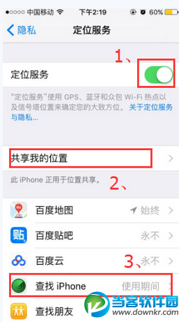 步骤3:如上图,1、打开定位服务,2、再共享我的位置,3、点击进入“查找iphone”,选择为始终使用。