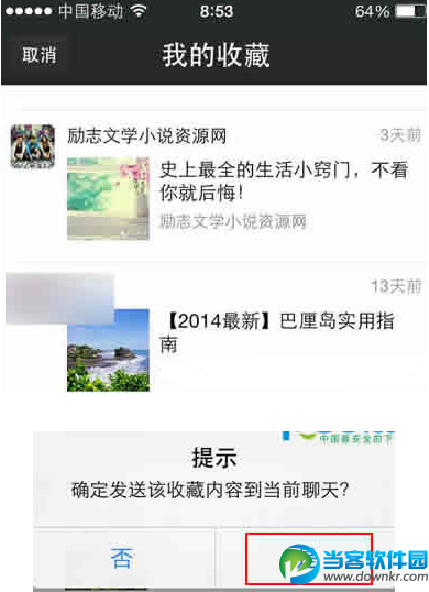 4、打开后,就会看到手机微信上的我的收藏,随便点一个想要在电脑上查看的收藏。会弹出提示,点是即可。