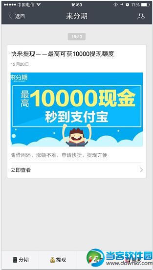 打开支付宝客户端搜索“来分期”服务窗 注册一个来分期账号这里就省略步骤了 注册之后右下角有个分期进去即可看到,剩下的就是把它带回家把。 以上就是用支付宝办理分期买手机教程,更多好玩有趣咨询请点击https://www.downkr.com/ 如果大家还有想了解关于更多关于软件相关的资讯,请关注当客下载站。本站会实时更新最有趣,最好看,最新鲜的资讯。当客下载站,值得你的关注。 |