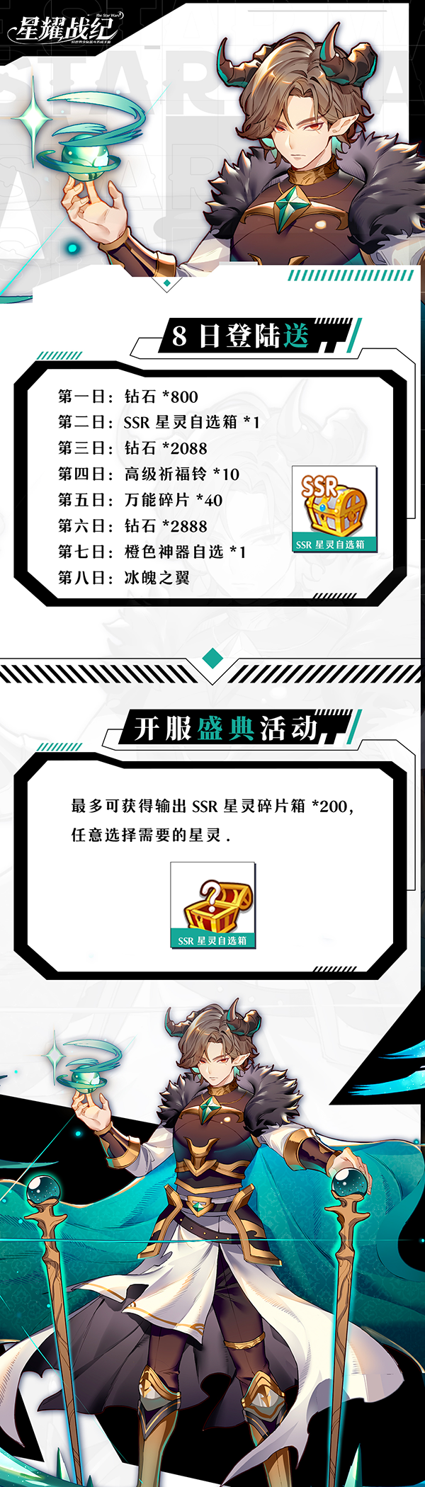 异大陆开启在即,部分活动已为各位星使整理完毕,请星使们点击长图查阅。 更多活动信息可在游戏内查看! 开服八日即送超值豪礼冰魄之翼~期间更有自选星灵箱送上! 特别召唤及阵营召唤等活动等待星使们参与~ 完成开服盛典活动,更有SSR星灵碎片箱*200领取,自由选择需要的星灵!