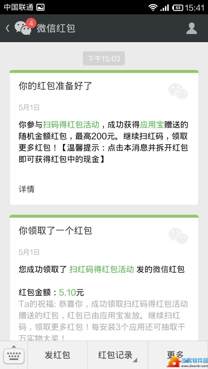 微信应用宝扫码中红包,金额随机。暂时每个红包(5.1元) 活动步骤: 2.点击安全下载(100%微信红包)。 3.等它下载完,你的微信就会收到“你的红包准备好了的信息”。(最好别安装,卸载应用后重新扫红码安装视为无效。如果下载完依然没那信息,就换个号试试吧。或者换个时间段再试试,换手机试试吧。) 4.点进去“你的红包准备好了的信息”,领取就行了,现在的90%都是5.1元红包。 5.然后再重复1~4步,又有一个红包。(每天只能扫2个红包) 6.点微信红包右下角的“更多”,然后“提现”,“提现到他人的银行卡”。然后输入你自己的名字,银行卡号,选择银行卡,再发验证码到你的手机,输入验证码。就可以等钱到账了。 7.如此类推,你再换一个Q号登陆,再重复1~6的步骤。那你一个QQ就有10元,一个月可以扫10个红包。就是说一个月可以有50元。一个QQ50元,10个QQ500元,100个QQ5000元。呵呵,开玩笑的。理论是这样,但是谁保证每个红包都是5元的,如果你好运可以抽到51元的红包。(我2014年5月1日 16:38:21刷了5个Q号,50多元了。) |