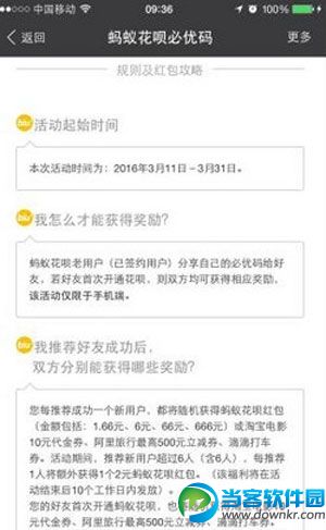 蚂蚁花呗必优码是什么?蚂蚁花呗必优码怎么使用。 最近,相信很多支付宝用户都发现了,支付宝最近又推出了新活动---支付宝蚂蚁花呗必优码活动,用支付宝蚂蚁花呗必优码可以换取现金红包和优惠劵,那么蚂蚁花呗必优码怎么使用呢?让小编告诉大家支付宝蚂蚁花呗必优码使用方法及规则吧。 蚂蚁花呗必优码 支付宝蚂蚁花呗必优码使用方法及规则: 本次活动时间为:2016年3月11日-3月31日。 蚂蚁花呗必优码 蚂蚁花呗必优码得奖励? 蚂蚁花呗老用户(已签约用户)分享自己的必优码给好友,若好友首次开通花呗,则双方均可获得相应奖励,该活动仅限于手机端。 我推荐好友成功后, 双方分别能获得哪些奖励? 您每推荐成功一个新用户,都将随机获得蚂蚁花呗红包(金额包括:1.66元、6元、66元、666元)或淘宝电影10元代金券、阿里旅行最高500元立减券、滴滴打车券。活动期间,推荐新用户超过6人(含6人),每推荐1人将额外获得1个2元蚂蚁花呗红包。(该福利将在活动结束后10个工作日内发放)。 您的好友首次开通蚂蚁花呗,也将随机获得淘宝电影10元代金券、阿里旅行最高500元立减券、滴滴打车券。 活动中所有蚂蚁花呗红包为定向红包,仅限蚂蚁花呗无线端支付时使用,暂不支持线下消费;该红包从领取之日起,有效期10天。其他优惠券使用方法详见后注。 推荐好友越多,拿到的福利就越多么? 是的。老用户获得的福利可叠加,每多拉一个用户,多获得一次福利。譬如:老用户A分享了必优码到微信群,活动期间有3位好友使用A的必优码首次开通蚂蚁花呗,则A可获得3次福利。每人最高可领取100次福利。 我想拿更多红包,有什么秘诀么? 吸引更多好友开通蚂蚁花呗,注意分享方式,提高成功率: 1、截屏分享到活跃的微信群,一一发送给好友效果比转发到朋友圈效果更好,分享到微博可以持续吸引好友参与; 2、分享时告知用户蚂蚁花呗是什么,吸引好友开通: 蚂蚁花呗是蚂蚁金服提供的信用消费服务; 账户没钱也能透支消费,这月买下月还; 按时还款,免利息免手续费; 支持自动还款,超方便; 3、提醒好友开通时务必记得输入你的必优码; 优惠券使用规则 A、淘宝电影票APP代金券: 1、代金券仅限在淘宝电影客户端(iPhone&Android)使用,可用于任意场次电影(万达影院除外),但不与其它优惠活动如特惠抢票、立减等同时使用; 2、代金券使用期限为领取之日起15日内,过期自动作废; 3、在获取和使用代金券的过程中,如出现违规行为(如作弊领取、恶意套现、虚假交易等),淘宝电影将取消您的中奖资格,并有权撤销违规交易; 4、如出现不可抗力或情势变更的情况(包括但不限于重大自然灾害、活动受政府机关指令需要停止举办或调整的、活动遭受严重网络攻击或因系统故障需要暂停举办的),则淘宝电影可依相关法律法规的规定主张免责; 5、本次活动最终解释权归淘宝电影所有,如有任何问题可拨打淘宝电影客服电话0571-88157838。 6、淘宝电影APP代金券可以在支付宝钱的卡券中看到。 B、阿里旅行最高500元出行随机立减券: 1)用户在阿里旅行客户端下单可享随机立减,最高金额可减500元; 2)立减券使用有效期:领到卡券之日起7天内有效,如未使用则自动过期作废; 3)本次获得的立减券可通过以下路径查询:阿里旅行客户端-我的-红包优惠券; 4) “出行立减券”仅限在阿里旅行客户端购买火车票、国内单程机票和汽车票使用,火车票和汽车票订单可享受的立减金额最多为订单总价的50%; 支付宝下载:https://www.downkr.com/soft/26545.html 更多资讯请点击:https://www.downkr.com/article/ 如果大家想了解更多关于软件最新资讯,请持续关注本站,本站小编将在第一时间为大家带来最好看、最有趣、最新鲜的软件资讯。更多精彩内容,尽在当客下载站。 |