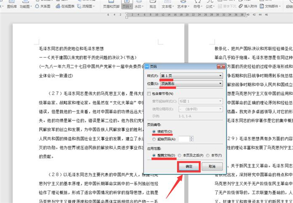 在弹出的对话框中,对页码的格式、位置、页码编号和应用范围进行设置,最后点击确定: