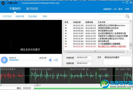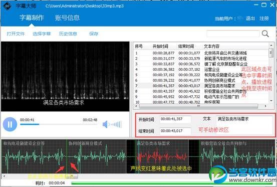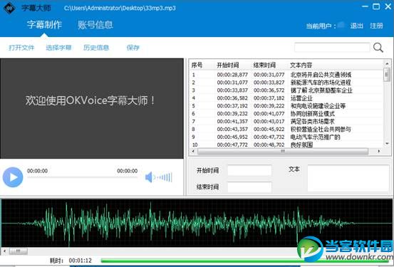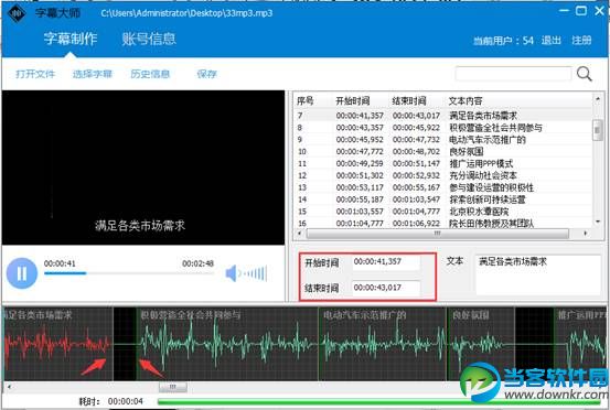 一段视频制作时,往往需要在视频下方添加字幕,可是一行一行的添加字幕,着实是太浪费时间了,那么如何批量添加字幕呢?小编给大家安利一款软件字幕大师,这个软件可以批量处理,自动加时间轴,以下是如何操作批量处理字幕的方法,随小编一起来学习下吧! 批量添加字幕教程: 1.导入音视频文件和文本文件,音视频文件支持普遍格式如mp3、mp4、wav、wmv、avi、mpg、mpeg;文本文件仅支持txt文件。点击“打开文件”按钮 2.进入该界面 3.然后依次选择音视频文件和文本文件(注:二者需是对应关系),点击“添加” 4.如需批量处理多个字幕文件,可重复“选择音视频+选择文本+添加”步骤。 5.依次导入音视频文件和文本文件后,点击“确认”,字幕大师即可开始对齐工作。稍等片刻,页面下进度条完成后,时间轴即可生成,如下图: 6.各处功能如图所示: 7.一般字幕对齐没有问题的情况下,字体为黑色,如果机器识别该处不准确或不正确,会标红提示,如图: 8.此时可以拖动时间轴上的竖线来完成修改(或手动修改“开始时间”和“结束时间”的数值) 9.校对完成之后,选择保存即可,默认为srt格式。 最后,这就是字幕大师如何批量添加字幕的教程,学习之后批量添加字幕效率有了明显的提升。还有同样问题困扰的用户,赶紧下载字幕大师,操作起来吧! |