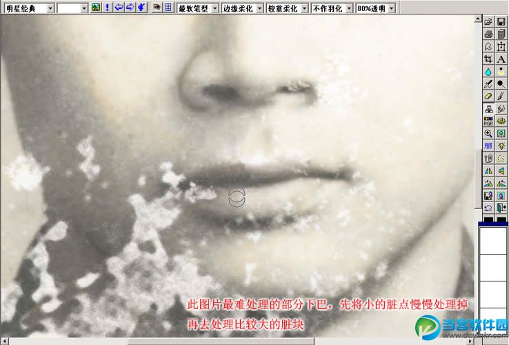 12.此图片最难处理的部分下巴,先将小的脏点漫漫处理掉再去处理比较大的脏块