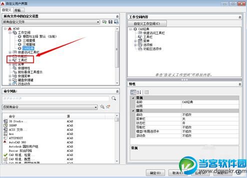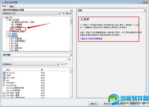 在使用CAD2015时候,界面焕然一新,不过,大家可能发现了,里面没有“CAD经典”这个选项,也就是说不能够直接调为cad经典界面,那么CAD2015怎么调出经典模式呢? 这是新版本直接去掉了,需要用的话,就按照下方的操作,“私人定制”一个“经典界面”即可。 打开CAD2015,在界面左下角,点击“齿轮状图标”,然后点击“自定义”。 进入用户自定义界面,默认的是进入“自定义”、如果没有发现下图中的界面,表明界面被折叠,点击箭头所示的“折叠图标”打开即可。右键点击“工作空间”,然后点击“新建工作空间”。 为了我们习惯,将新建的工作空间重新命名为“CAD经典”。 新建一个工作空间之后,点击左方的“工具栏”,展开工具栏工具。 这时候右边显示的是工具栏的相关信息,这时候点击“CAD经典”,打开“CAD经典右方的界面。 将我们平时常用的工具,比如“标注”、绘图、查询等等工具,使用鼠标左键按住不放这些工具,拖动到右方的“工具栏”,然后松开鼠标左键。 同理,打开左方的“菜单栏”,把里面的工具拖到右方的“菜单栏”,把左方的“选项板”拖到右边的“选项板”。 然后点击下方的“应用”,使刚才的改变生效。