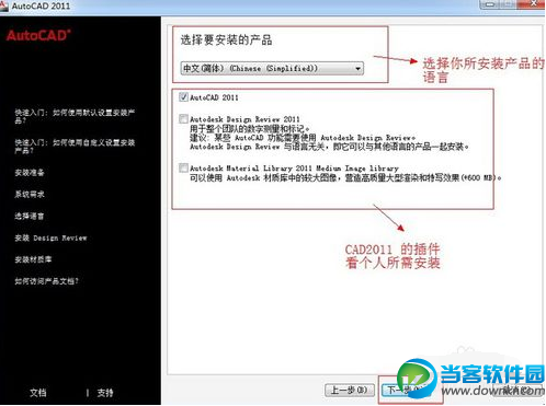5、CAD2011 安装前的设定,在语言栏里选择“中文简体”还有就是CAD2011自带的一些插件。这个看个人所需自行安装。点击“下一步”继续安装