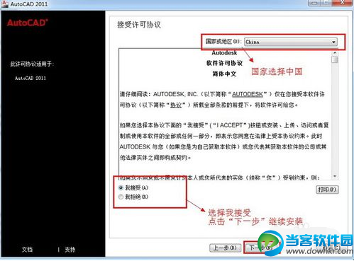 6、CAD2011 64位中文版的许可协议界面,在国家或地区栏里选择“China” 点击“我接受”在点击“下一步”继续安装