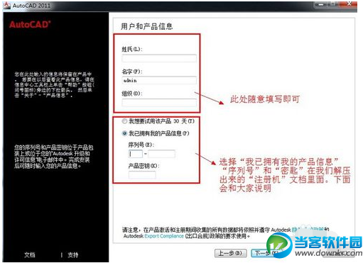 7、Auto CAD 2011的用户和产品信息,这个用户信息自己随意填写即可。选择“我已拥有我的产品信息”序列号和产品密匙在我们解压出来的“注册机”里面