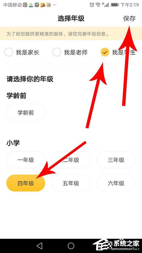 4.打开“选择年级”界面以后,首先勾选您的身份,然后点选所在班级,最后点击“保存”