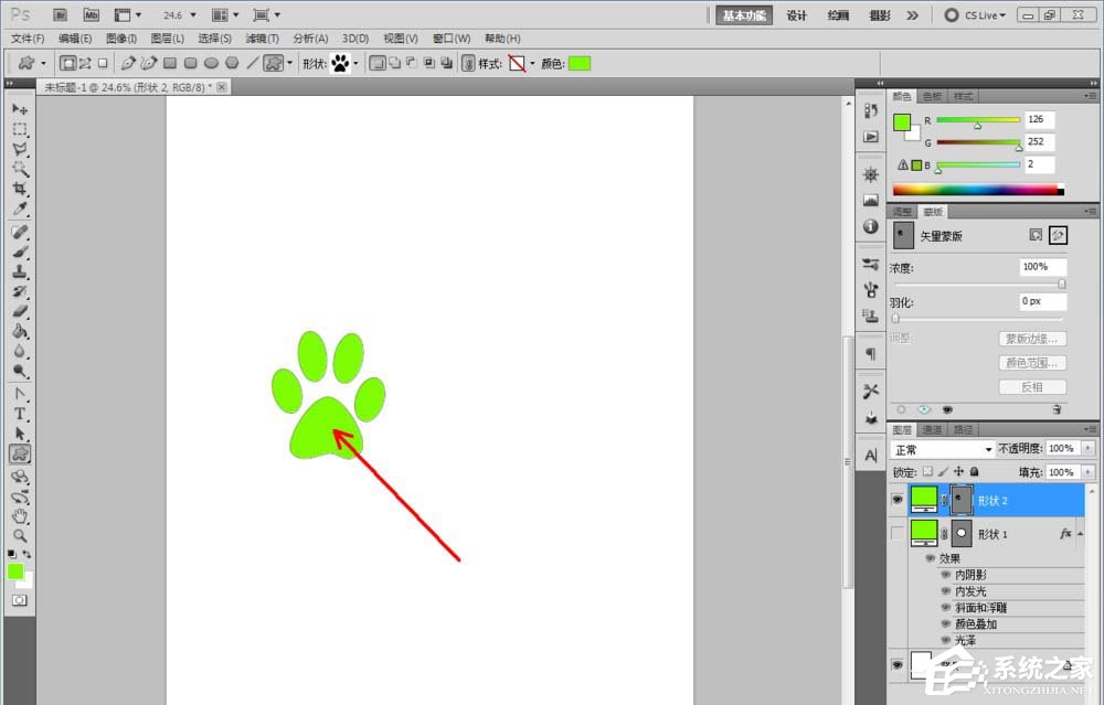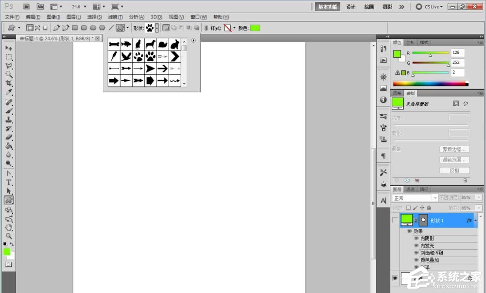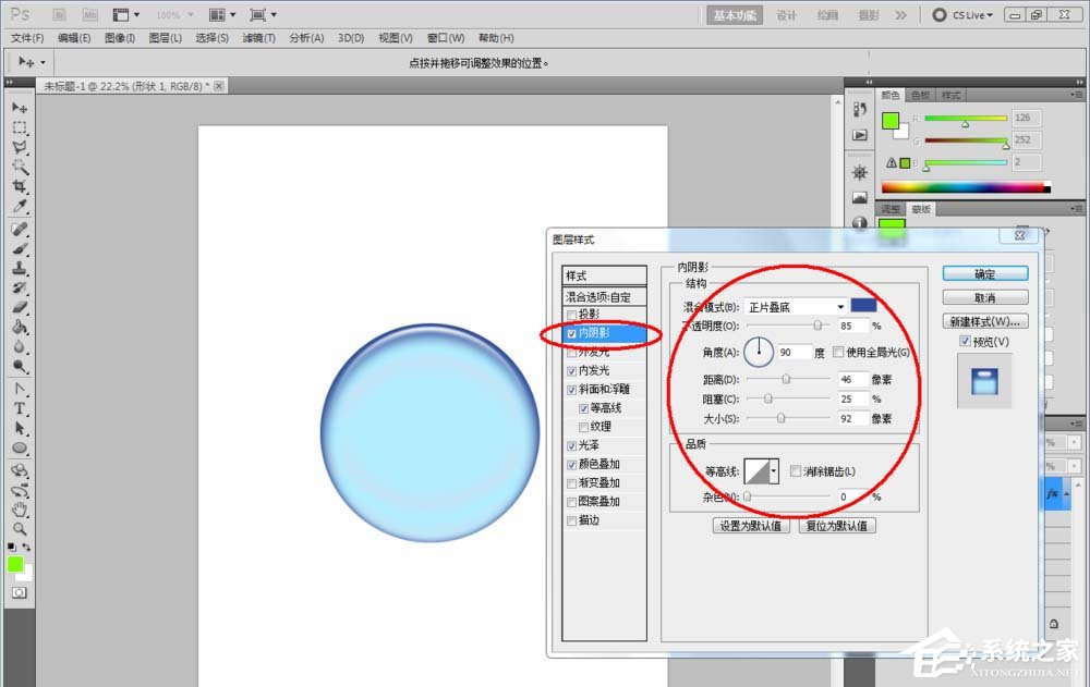 ps如何制作凝胶效果的logo?最近有小伙伴问我如何使用ps制作一个凝胶效果的logo,那么今天小编就给大家带来ps制作凝胶效果logo的具体方法步骤,让我们一起来看看吧。 方法/步骤 1、打开Photoshop CS5软件,点击【文件】-【新建】,按图示参数新建一个ps文档; 2、点击【椭圆形工具】,点击【形状图层】并将颜色设置为:绿色,按住键盘【Shift】键不放,鼠标拉动绘制出一个规则圆形(如图所示); 3、鼠标双击图示区域,弹出【图层样式】设置栏,勾选【内阴影】、【内发光】、【斜面和浮雕】、【光泽】以及【颜色叠加】,并按图示设置好对应的各个参数,完成圆形图案的凝胶效果制作(如图所示); 4、对于其他不规则图案凝胶效果的制作方法也是一样的。首先,点击【自定义形状工具】,在作图区域绘制出四个不同形状的自定义图案(如图所示); 5、找到刚刚制作好的圆形图案图层,鼠标右键点击图层空白区域-【拷贝图层样式】后,选中四个自定义图案的图层,点击鼠标右键-【粘贴图层样式】,这样我们的自定义图案的凝胶效果也就制作完成了 注:更改凝胶效果的颜色可在图层样式设置栏中进行更改。 这就是ps制作凝胶效果logo的具体方法步骤啦,大家都学会了吗?还想了解更多的软件教程请关注系统之家。 |