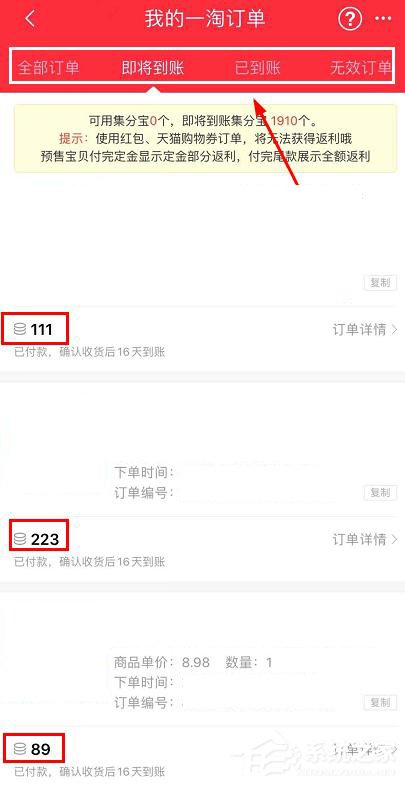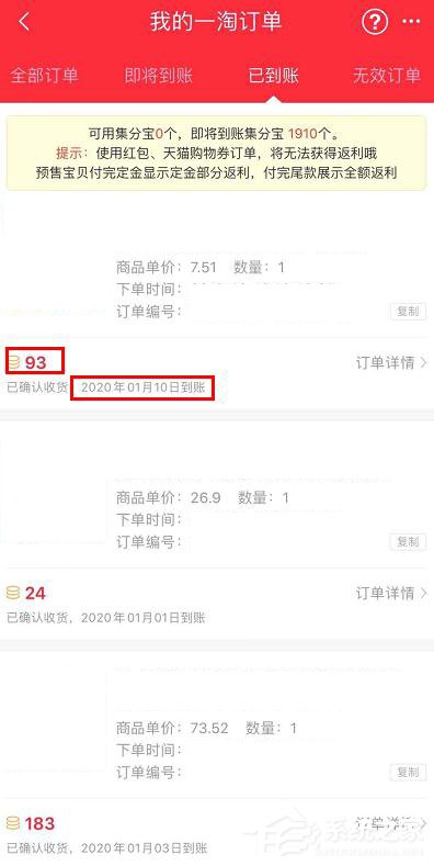 3、可以查看到每个订单即将到账的集分宝情况。