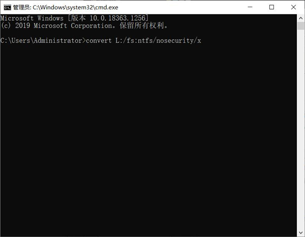 3、输入如下命令convert L:/fs:ntfs/nosecurity/x。