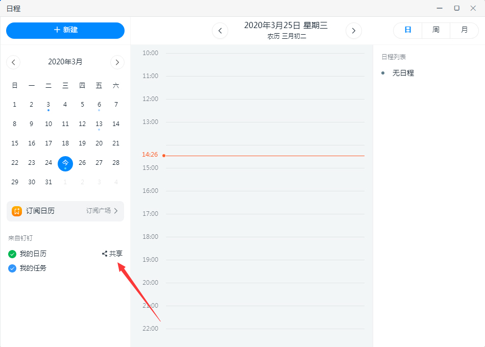 在新窗口中找到“我的日历”选项,点击右侧的“共享”图标;