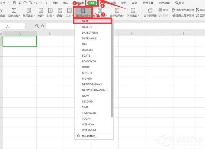 2、选择工具栏中的【公式】选项,在下拉菜单中点击【日期和时间】,在弹出的菜单中选择【DATE】: