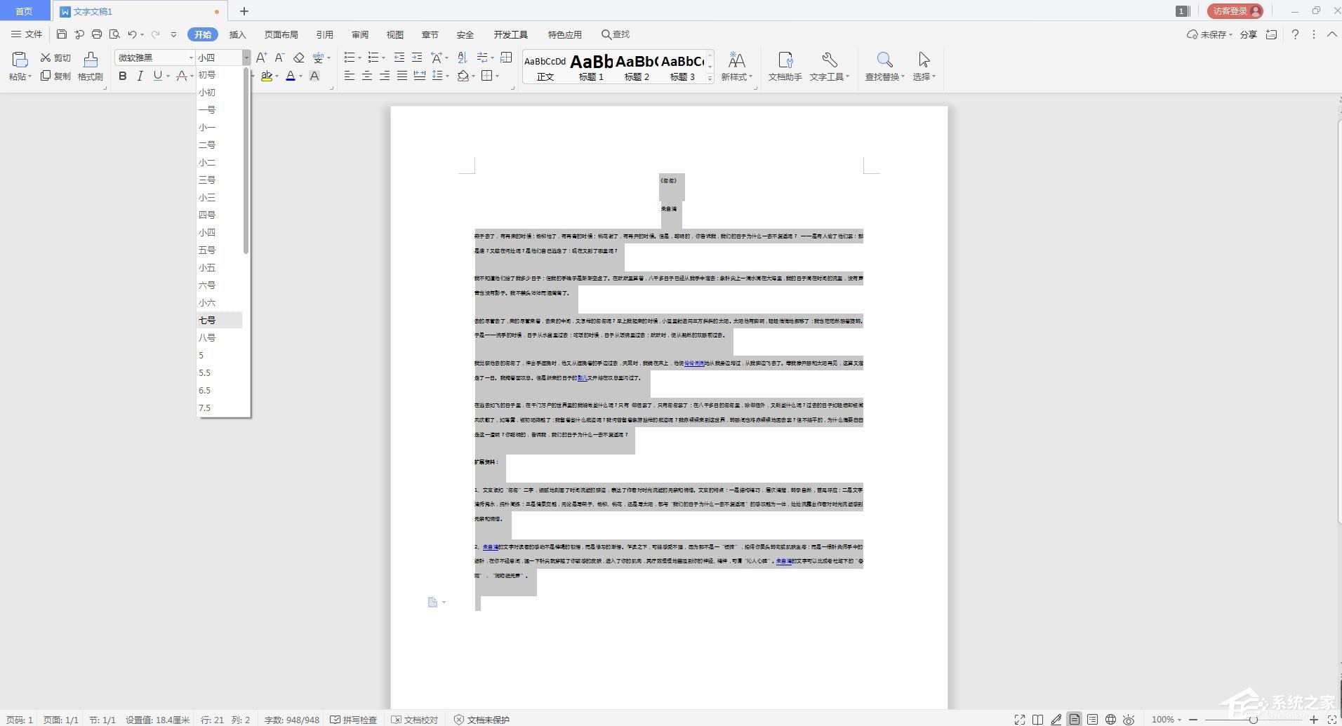 2、按住Ctrl+A将文本内容全选,然后字体设置为宋体,字号设置为七号,这样打印出来的效果最好。