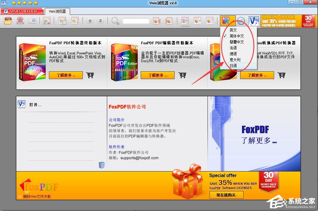 VSD浏览器是FoxPDF软件公司研发的一款文件浏览器,它可以阅读和打印任何Visio (VSD)文档和Rtf文件,并且还拥有平移、缩放文件的功能,同时VSD浏览器还拥有多国语言,用户可以根据自己的需要选择语言。那么,VSD浏览器如何更改语言呢?下面,我们一起往下看看。