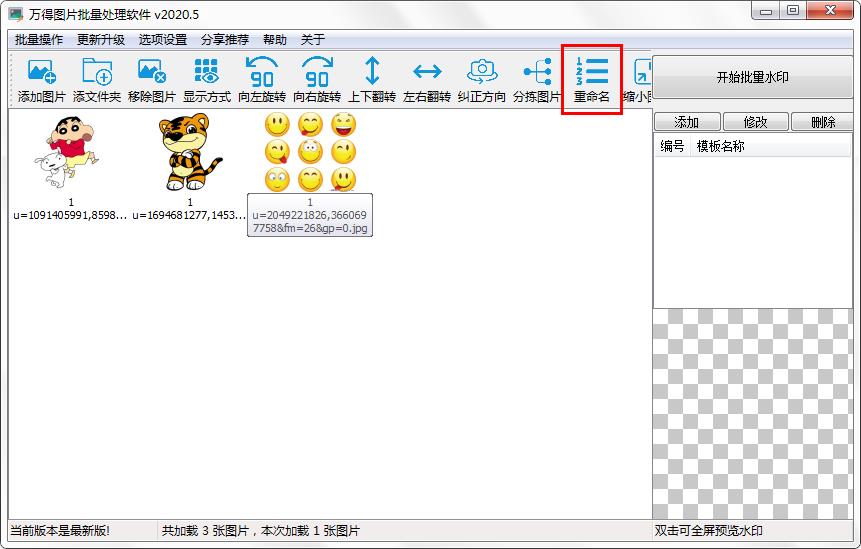 2.成功添加完图片后,我们需要在软件上方找到我们的【重命名】功能按钮,并输入新名字。