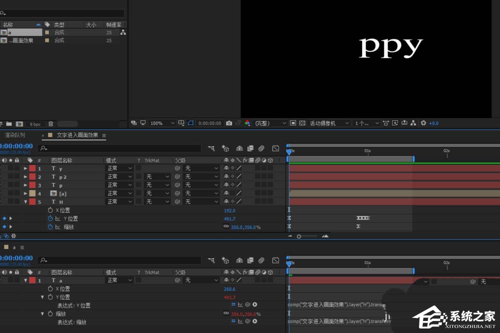 ae如何制作文字从底部慢慢进入的动画效果?对于ae的使用方法,在之前的教程里也说了很多,发现很多小伙伴对此也很感兴趣,那么今天的教程小编带来的是ae制作文字从底部慢慢进入动画效果的方法步骤,让我们一起来看看吧。 方法/步骤 1、打开AE软件,命名文字进入画面效果,调整相应的参数。 2、CTRL+T 输入想要的文本内容;Happy;五个字母单独为一层;中心调整至相应的字母中心处; 3、首先对字母H的动向进行设置,P键打开位置属性,将位置的X.Y属性右击单独设置(单独尺寸); 4、我们给位置的Y轴K关键帧,原始位置为最终的位置,初始帧0秒出移动到画面之外,对y轴进行调整,也就是在画面的底部,开始先不显示;为了让出现的效果不那么的单调,我们在K关键帧的时候做一个类似于回弹的效果;开始的时候高于最终位置,下一帧在最终位置的下一点,最好回到最终位置; 5、给S缩放K关键帧,让文字看起来有一个由前往后进行一个抛物运动,所以一开始的时候文字是一个大于它正常大小的一个缩放值,这样就会给人一种视觉上的近大远小的效果; 6、a字母预合成Ctrl+Shift+C,然后双击进入预合成a里面,把a窗口拖移到这个画面中的底部形成上下的位置,这样方便我们进行表达式的关联,同样将a字母的P进行x.y的分离,按住Alt键来点击Y轴前的小秒表,将Y跟H的Y进行关联,同样的方法将缩放关联一下;这样两个属性的表达式都关联成功了;H和a的效果一模一样,通过错开显示时间,剩下的字母做同样的操作,利用系列图层知识点将两两字母之间间隔时间错开一样就好。 这就是ae制作文字从底部慢慢进入动画效果的方法步骤啦,大家都学会了吗?还想了解更多的软件教程请关注系统之家。 |