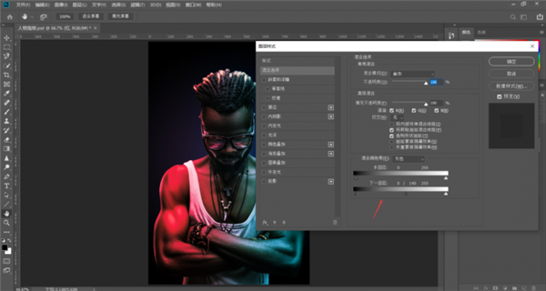 11、双击图层,打开混合样式,在混合颜色带中选中下一图层的小三角形,按住Alt键拖到下图位置;