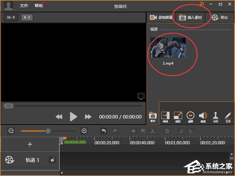2、登陆完毕后在剪辑师界面的右上角点击“插入素材”按钮,并将想要分离音轨的视频添加进来;