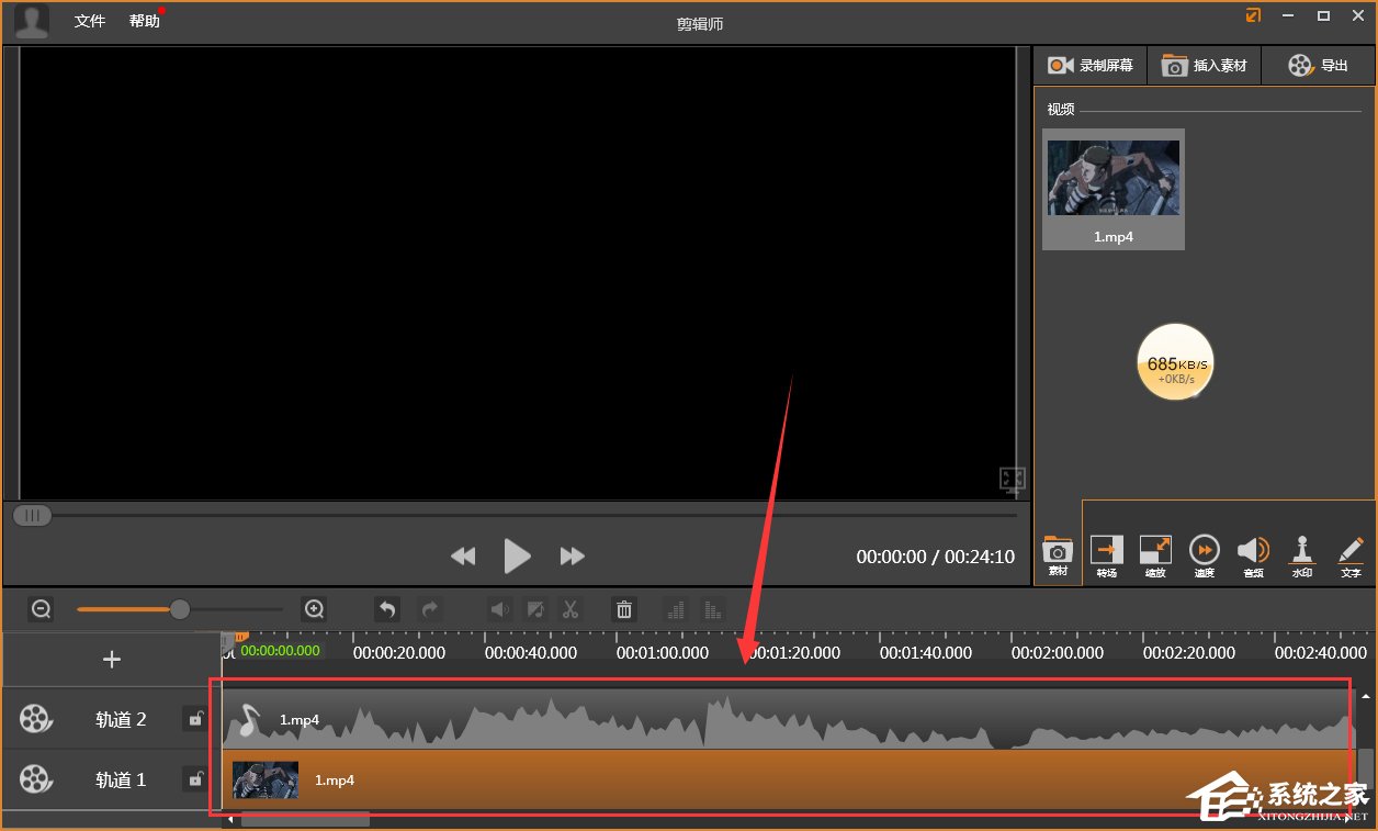 5、之后你会发现视频和该视频的音轨被分到了两个素材区,这就说明视频和音轨分离成功了,之后点击导出就可以将视频和音轨导出了;