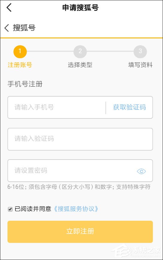 3、如此一来,大家从申请搜狐号的页面里填写好手机号,账号注册类型和个人资料详情,就可以等待官方客服审核了。