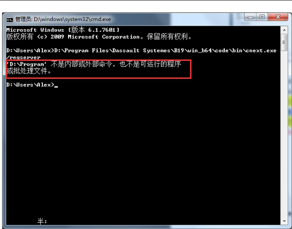 2、在 dos 窗口输入 CATIA 完整路径,以 CATIAR21 为例 C:DassaultSystemes64B21win_b64codeincnext.exe /regserver (注意:“/”前面有个空格)。我这里的安装路径 C:DassaultSystemes64B21win_b64codeincnext.exe 没有空格,如果你的安装路径类似于 D:Program FilesDassault SystemesB21win_b64codeincnext.exe,里面有空格,需要将有空格的路径用英文的引号,引起来: