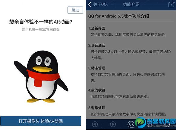 提示用电脑打开QQ官方网站http://im.qq.com,然后打开手机摄像头对准屏幕,即可开启AR(增强现实)体验,也就是蹦出来一只立体化的企鹅,但也仅此而已。 不过很快,这个版本又消失了,任何渠道都寻找不到,估计是不小心泄露了出来,毕竟QQ的每个新版本都是要先公开体验的。 已安装的倒是可以正常使用,在版本介绍中可以看到如下更新日志: 1、全新界面 架构化繁为简,冰川蓝带来灵动清爽的视觉体验。 2、语音通话 可快速转为3人以上多人通话或视频,最高可容纳50人畅聊。 3、动态管理 支持自定义管理动态页面,只关心你感兴趣的内容。 4、我的收藏 收藏的精彩图片可左右滑动快速浏览。 5、消息处理 长按并拖动未读消息数字即可快速消除未读提醒。 |