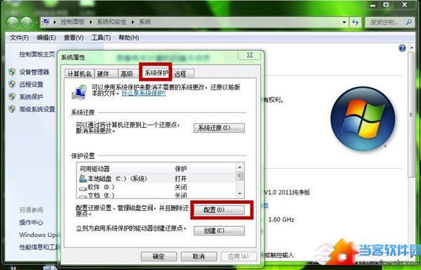 3、在“系统属性”窗口中,选中“系统保护”,点击“配置”。