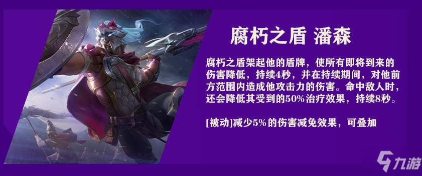 腐朽之盾潘森的技能可以架起盾牌,自身获得4s减伤。在技能持续期间可以对前方范围内的敌人造成伤害,命中会降低敌人50%治疗效果,持续8s。
