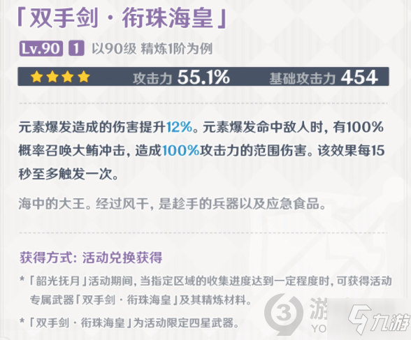 原神新武器衔珠海皇怎么样?衔珠海皇是游戏原神即将上线的新武器,很多玩家还不太了解这个武器,所以小编给大家带来了原神新武器衔珠海皇介绍,一起来看看吧。 原神新武器衔珠海皇怎么样衔珠海皇 海中的大王,经过风干,是趁手的兵器以及应急食品,四星双手剑。 装备描述 以90级精炼1阶为例 攻击力:55.1% 基础攻击力:454 元素爆发造成的伤害提升12%。元素爆发命中敌人时,有100%概率召唤大鲔冲击,造成100%攻击力的范围伤害。该效果每15秒至多触发一次。 获得方式 活动兑换获得 「韶光抚月」活动期间,当指定区域的收集进度达到一定程度时,可获得活动专属武器「双手剑·衔珠海皇」及其精炼材料。 「双手剑·衔珠海皇」为活动限定四星武器。 以上便是小编为大家带来的原神新武器衔珠海皇介绍了,相信各位玩家一定更加了解这把武器了,更多内容可以关注本站。 >>>查看原神攻略大全<<< >>>查看原神专题<<< |