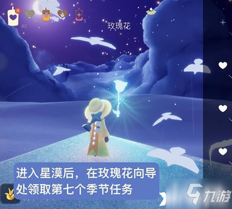 1、首先从禁阁进入星漠地图,找到玫瑰花光遇先祖领取任务;