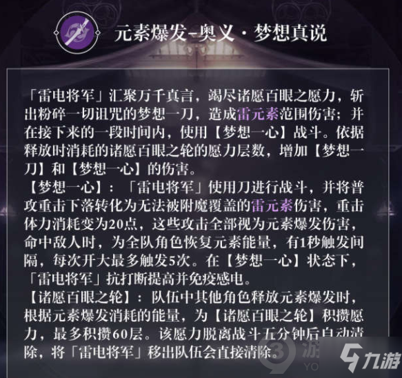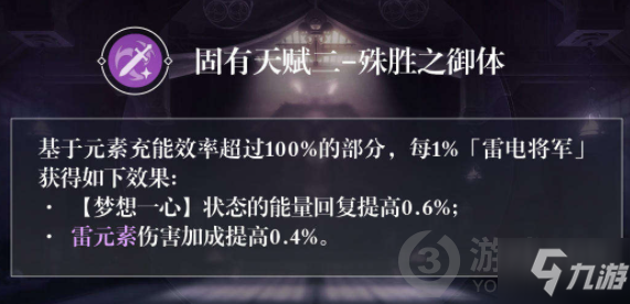 原神雷电将军怎么玩?雷电将军是原神2.1版本新增的角色,很多抽到她的玩家不知道雷电将军该怎么玩,所以小编给大家带来了原神雷电将军玩法攻略,一起来看看吧。 原神雷电将军怎么玩角色概览 雷电将军(简称雷神)是2.1版本推出的雷元素长柄武器角色,也是稻妻的掌 权者、尘世七执政中的雷之神。雷神是一位充能特化增伤辅助兼副C,完美适配绝缘之旗印四件套。在场上时她能够利用元素爆发为全队角色补充大量元素能量,对充能困难的主C循环有较大帮助。在场下时则能为队友提高大招的伤害。此外,队友释放的元素爆发和获得的微粒能够为雷神积攒愿力,提升她下一次大招的倍率。 天赋加点 以下的加点仅为综合考虑雷神各技能的重要度推荐,9级以上天赋资源消耗巨大,因此下文也会以性价比较高的8级天赋数据为准,真爱党根据自己喜好升满。 普攻/元素战技/元素爆发:1/6/6→ 1/6/8 → 1/8/8 → 1/8/9 → 1/9/9 → 6/9/9 推荐优先加点元素爆发,元素战技也会影响其增伤数值,不推荐非厨力党点普攻。每提升1级天赋,元素爆发的伤害提升6.3%,元素战技的伤害提升6.2%。 天赋分析 雷神的天赋决定了她最适合与高能量消耗、元素爆发本身高伤害的充能困难户输出角色配合使用。 普通攻击:【源流】 雷神长柄形态的普攻重击倍率低,享受不到自身的任何加成,装备也不会选择此类型加伤,不推荐非真爱党加点。 元素战技:【神变·恶曜开眼】 雷神的元素战技享受不到自己常用装备的加成,也不是快照,但持续时间长达25秒,施加弱雷附着,触发条件为任意攻击造成伤害,怪物有无敌盾则无法触发,不能指望元素战技用来破盾。斩击无视伤害判定位置和角色的距离(也就是距离很远造成伤害也能触发),释放一次就能提供约1733%后台输出(按照触发23次的期望计算),在18秒的一轮循环中约占总伤害的15%。此外元素战技等级还会影响元素爆发的加伤数值,这个加伤效果包括后台队友的脱手大招和雷神自己。产球方面,技能的第一段和后续每段斩击都有约50%的概率产出1颗雷元素微粒(测试结果可能存在误差,欢迎纠正),高产球效率对主打雷伤大招的武装队和雷神自己循环都至关重要。 元素爆发:【奥义·梦想真说】 元素爆发是「雷神」的核心输出与辅助手段,在18秒的一轮循环中约占总伤害的85%,是本游戏第一个需要消耗90能量的大招。持续时间短意味着「雷神」虽然倍率不出众,却拥有极高的吃拐率,绝大部分时间较短的强力buff她都能享受到。以【绝缘】4的满加成数值300%充能效率为例,配合固有天赋总共能为全队回复27.5能量,该效果不受队友充能效率影响,也不会像元素微粒那样按照编队人数造成充能比例衰减。 这个充能效果是什么概念?以冰系目前最高效的产球辅助「迪奥娜」为例,每次长按E期望产出4个冰元素微粒,使用满精【祭礼弓】每16秒获得24能量,平均1.5能量/s,而「雷神」则为1.53能量/s略胜一筹,这里没有算入「雷神」元素战技的微粒。此外,「迪奥娜」的能量回复还受到后台衰减和不同元素打折扣,「雷神」的全队固定数值回能则是实打实的。当然这不意味着「雷神」可以全方位替换其他产球辅助,一些强力冰主C,例如「神里绫华」还是很需要双冰共鸣的暴击率的。 【梦想一刀】施加的附着为强雷,后续普攻重击附着弱雷,重击判定距离比单手剑角色还要长。如果想要打出更高的伤害,推荐使用aA闪避的手法(小写指普攻,大写指重击)。【梦想一心】持续时间内「雷神」能够打出5次aA,体力充足时使用闪避取消后摇最多可打出6次。需要注意的是,【梦想一心】状态下的普攻重击都算作元素爆发伤害,因此常规的普重加伤装备对这个状态是不生效的,「雷神」更适合携带大招加伤型装备。【梦想一心】普攻能够触发「行秋」的剑雨,但不能触发「北斗」的闪雷。 【梦想一心】会极大幅度地提升「雷神」抗打断力,效果几乎等同于霸体。如下图所示,即使是遗迹守卫的大风车攻击也无法对「雷神」造成硬直。这意味着「雷神」并不是特别依赖护盾,但仍然需要治疗减伤等保命手段。 当「雷神」编入队伍时,队伍中其他角色释放元素爆发后能够积攒【愿力】,每消耗1点元素能量折算为0.2层,【愿力】能够提升「雷神」下一次开大拔刀和刀形态普重的倍率,因此在每轮循环中应当优先释放其他角色的大招,最大化「雷神」的大招伤害并充分利用其全队充能的效果。但0命「雷神」时机合适就释放大招即可,刻意去攒满层的【愿力】反而会耽误输出循环。首次获得【愿力】后会在场上角色的背后生成一个【诸愿百眼之轮】,神环上闪光点的个数代表积攒的【愿力】层数,每积攒10层就会点亮一个更大的闪光点,便于分析当前【愿力】大致层数。 固有天赋 20级突破后获得,加快【愿力】积攒的速度,配合「雷神」产球频率高的元素战技基本可以保证全程触发。 固有天赋二 60级突破后获得的核心被动,开大的回能效果提升超过1倍,正是因为这个被动使得「雷神」堆充能的收益高,下文将详细分析她的各属性收益。 固有天赋三 能够节省养成资源的实用天赋,突破一把五星单手剑/长柄能够省出11.25万摩拉,四星武器为7.5万。 命座解析 「雷神」的前3个命之座在输出方面提升巨大(约80%)。后3个命座提升辅助能力但效果较差。推荐有意愿抽取命座的玩家以2命为核心目标,而且抽取2或3命的