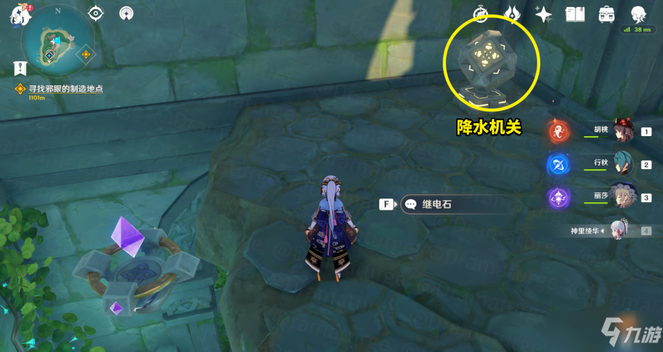 2、完成1后,四个雷方碑会解锁,在一定时间内点亮这四个雷方碑(用丽莎即可),即可让水位下降。