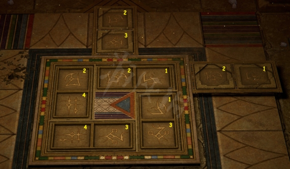 该谜题内一共有四种瓷砖,不同的瓷砖在下图用不同的数字表示。