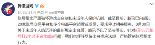 9月的游戏行业可谓风风雨雨,国家新闻出版署《关于进一步严格管理 切实防止未成年人沉迷网络游戏的通知》明确指出,向未成年人提供游戏服务的时间,每周只有周五到周日3天内晚间各1小时。不过总有不法商家想要尝试去钻漏洞,央视近日就起底了游戏账号租卖的灰色产业链,据曝光只要花33块钱就能租号玩游戏! 央视报道称,记者调查发现,网络上可以通过租号、买号等途径绕过监管无限制玩网游,游戏账号租卖已形成灰色产业链。 记者选择了一家店铺,在王者荣耀租号区,花费33元租了两个小时账号,按店家提示进入游戏界面,整个过程并没有触发任何实名认证系统。 此前报道,在最新的防沉迷要求中提到,严格限制向未成年人提供网络游戏服务的时间,所有网络游戏企业仅可在周五、周六、周日和法定节假日每日20时至21时向未成年人提供1小时服务,其他时间均不得以任何形式向未成年人提供网络游戏服务等内容。 此后,中国音数协游戏工委各会员单位、游戏企业坚决拥护主管部门决策部署,第一时间将通知精神充分领会,并迅速在企业内、项目组落实责任,部署工作。 据统计,截至9月6日共有63家单位通过官方渠道以公告、通知等方式,表明态度,回应关切。 另据新京报报道: 昨日(9月6日)晚间,@腾讯游戏 发文回应“花33元租号打2小时王者荣耀”称,账号租卖严重破坏游戏实名制和未成年人保护机制,截至目前,腾讯已向超过20家账号交易平台和多个电商平台起诉或发函,要求停止相关服务。针对该问题,腾讯游戏也呼吁尽快出台相应法规,严格管制账号租卖行为。 |